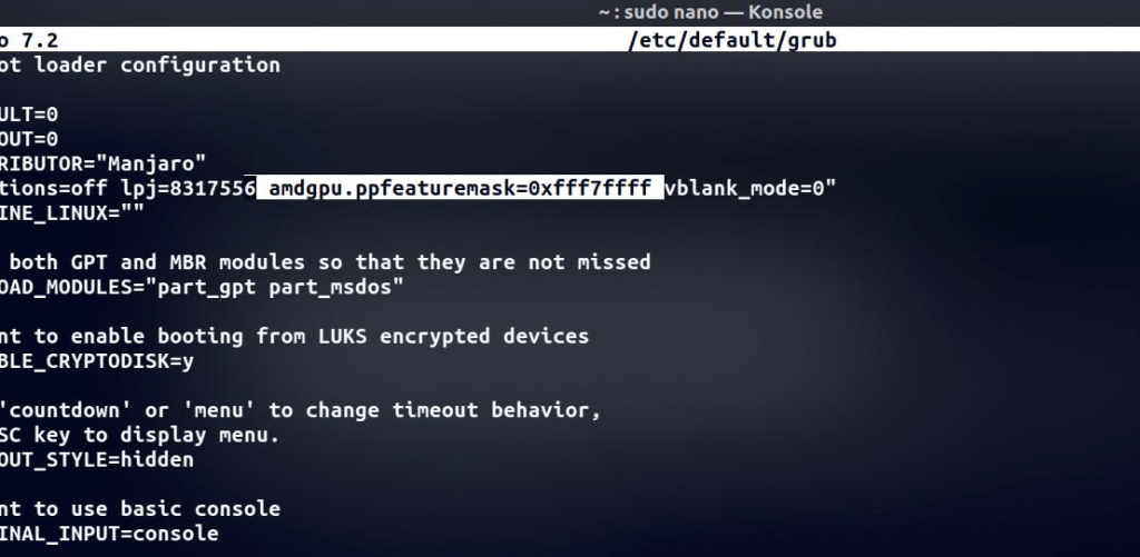 Полученное значение amdgpu.ppfeaturemask= у каждого свое уникальное значение , вставляем конфиг grub , по пути sudo nano /etc/default/grub