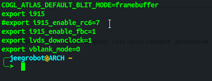 Параметр export i915_enable_rc6=7 отвечает за алгоритм сжатия буфера кадров что увеличивает немного отзывчивость системы и FPS , однако не всегда работает корректно и может приводить к к тому что оболочка запускается в черный экран , кроме того влияет на запись экрана которая может быть некорректно записана поэтому в зависимости от того как ведет себя система можно включить данную опцию убрав решетку или отключить , вернув решетку наместо . Параметр export vblank_mode=0 отключает вертикальную синхронизацию по всей системе и для любого приложения , эта опция иногда выручает при проблемах с записью экрана и повышает фпс и отзывчивость всей системы , использовать вместе с параметром сжатия буфера кадров можно и ничего не сломается , но эффект лучше не будет , каждая опция выполняет свою конкретную работу и будут мешать друг другу , отключение вертикальной синхронизации не будет нормально работать , поэтому рекомендую использовать что то одно . Параметр COGL_ATLAS_DEFAULT_BLIT_MODE=framebuffer активирует фрембуфер . Все остальные параметры связаны с включением стандартных опций драйвера i915 который работает для видеокарт intel по умолчанию