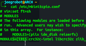 Далее , если вы этого не делали раньше то надо это сделать , надо добавить модуль дравера intel в /etc/mkinitcpio.conf